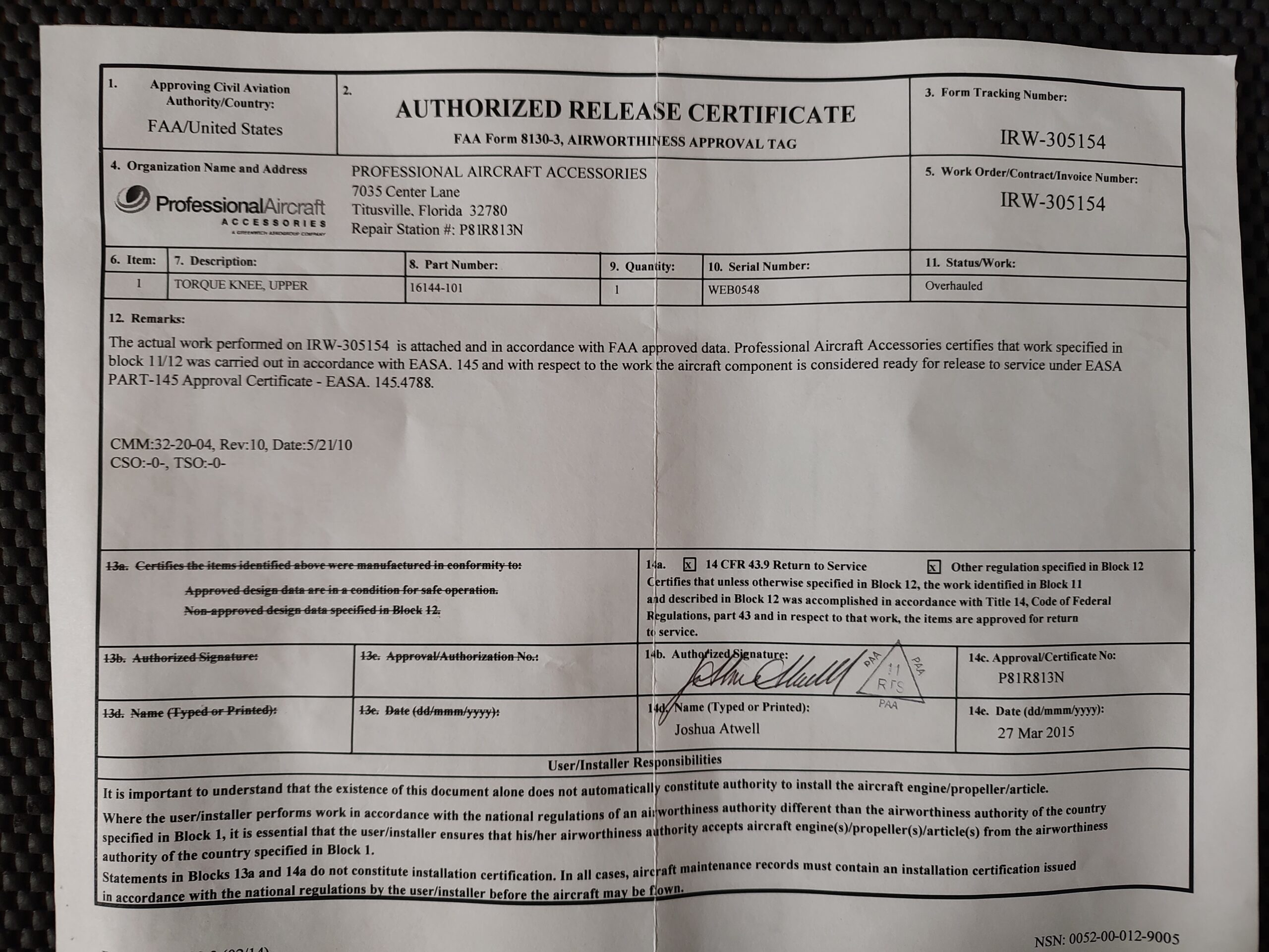 Certification: 8130-3 EASA