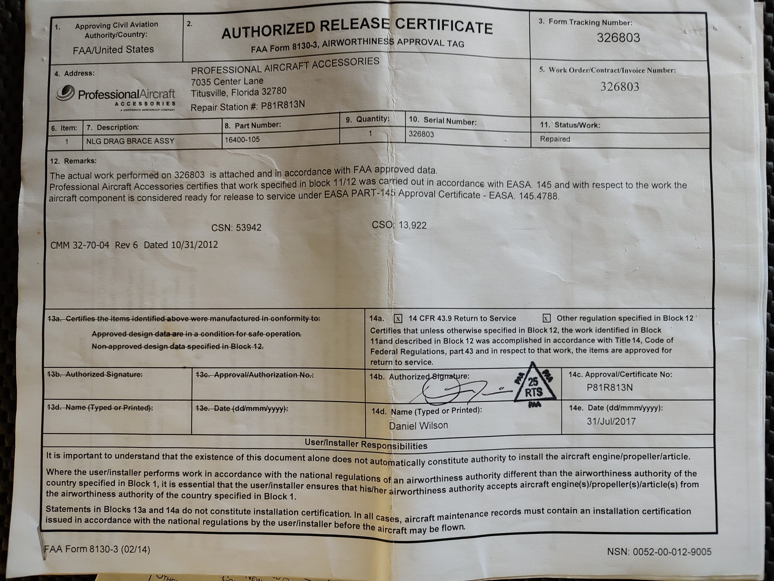 Part Description: NLG DRAG BRACE ASSY
