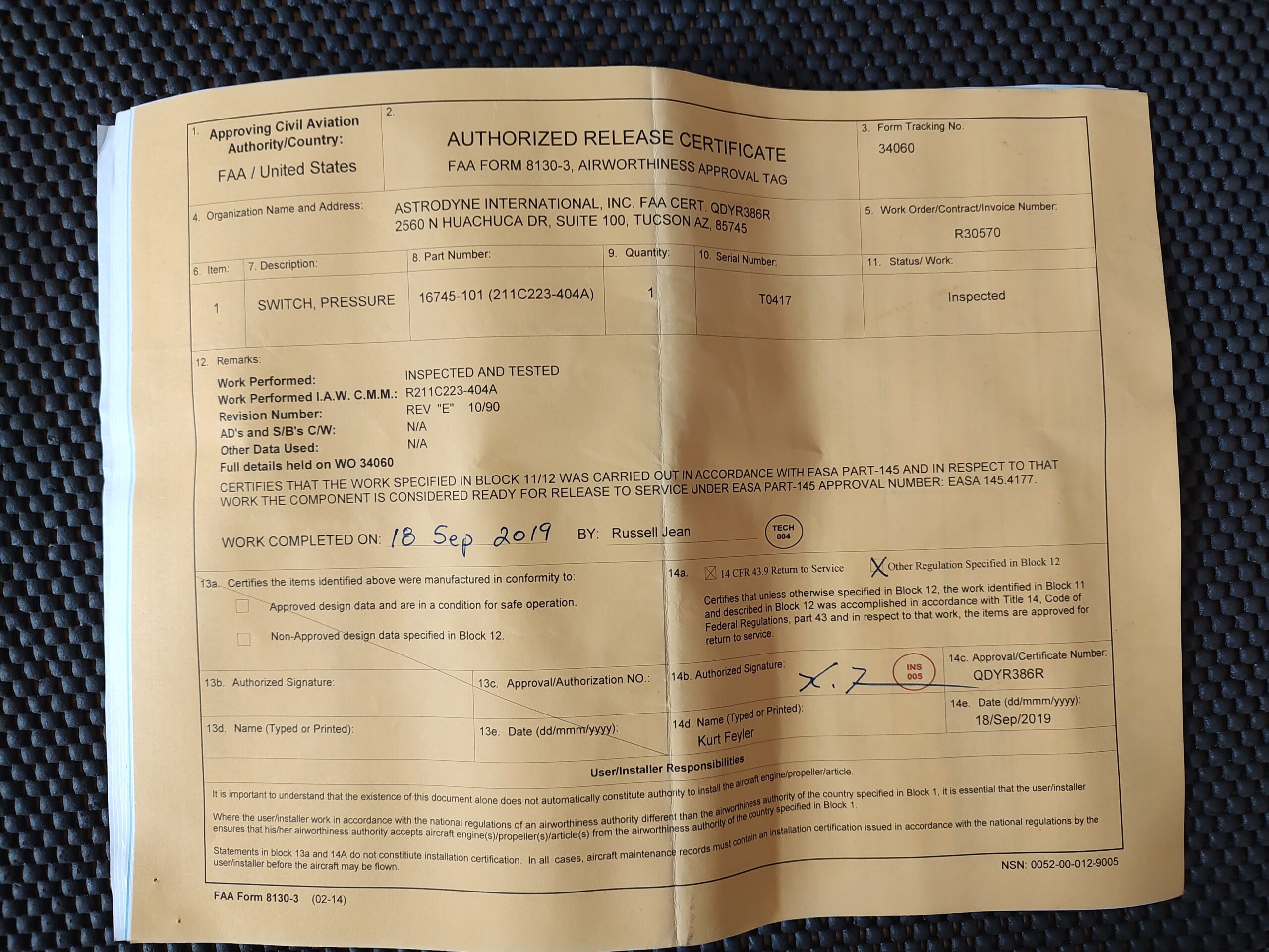 Certification: 8130-3 EASA