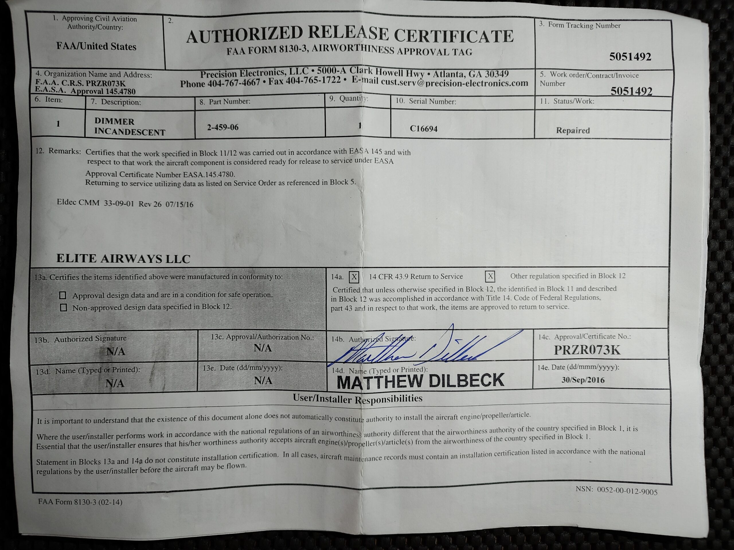 Certification: 8130-3 EASA
